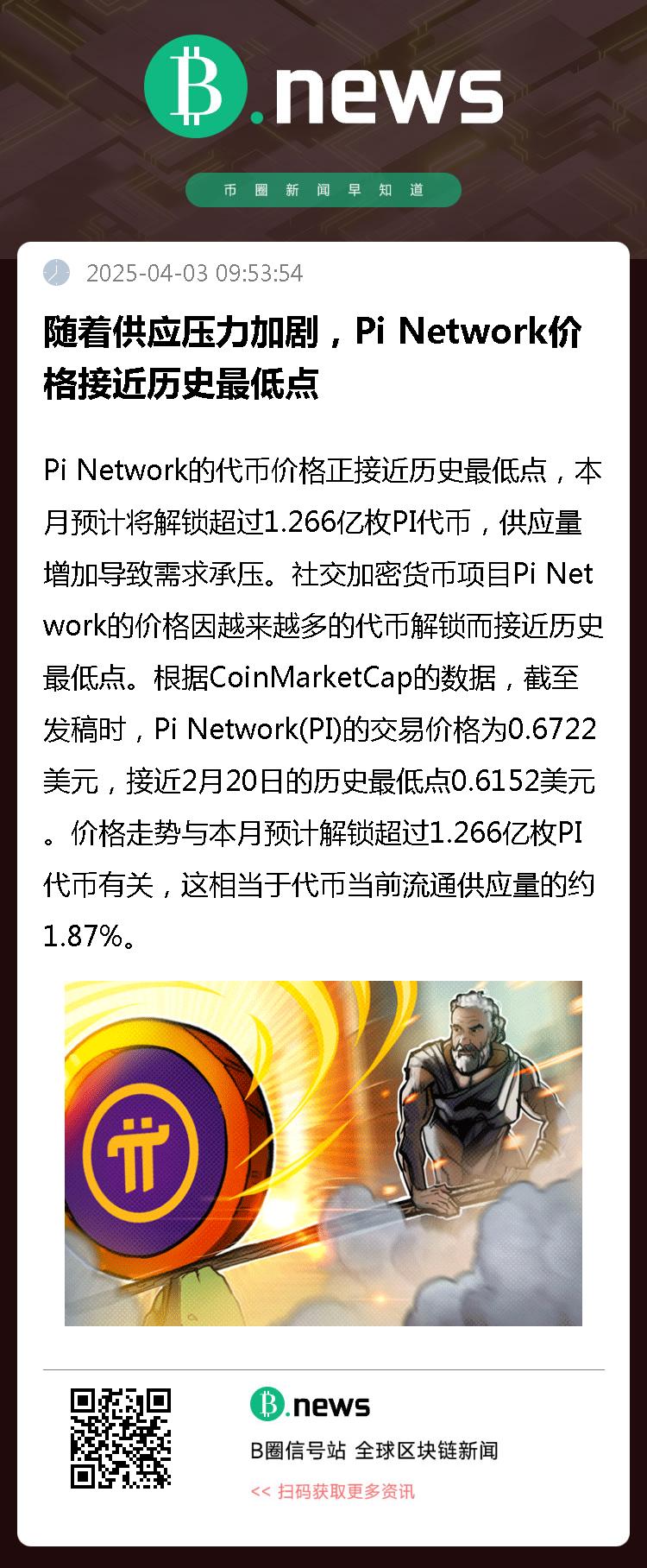 Pi Network的代币价格正接近历史最低点,本月预计将解锁超过1.266亿枚PI代币,供应量增加导致需求承压。