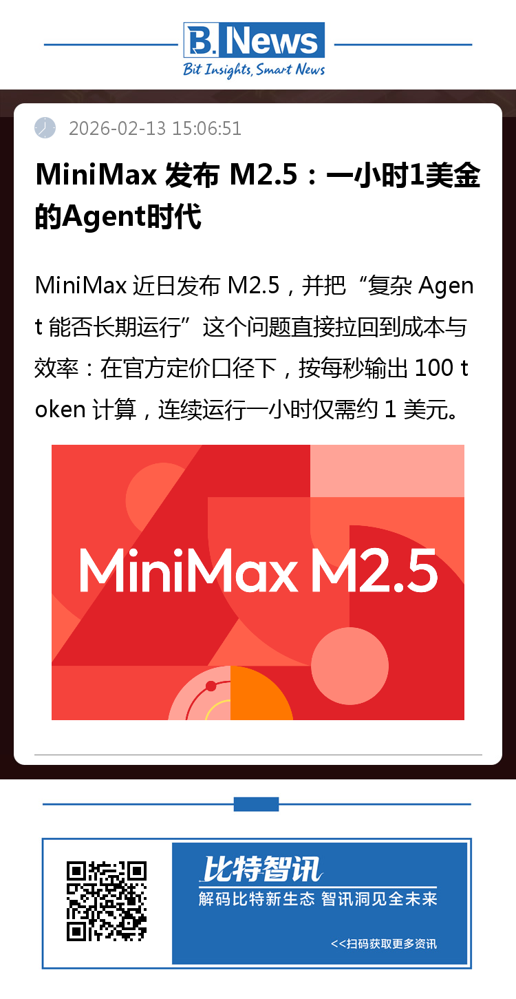 过去 108 天内,MiniMax 连续发布 M2、M2.1、M2.5,多项核心指标持续攀升。官方强调,其目标是“在没有成本约束的情况下运行复杂 Agent”,而 M2.5 已接近这一阶段。