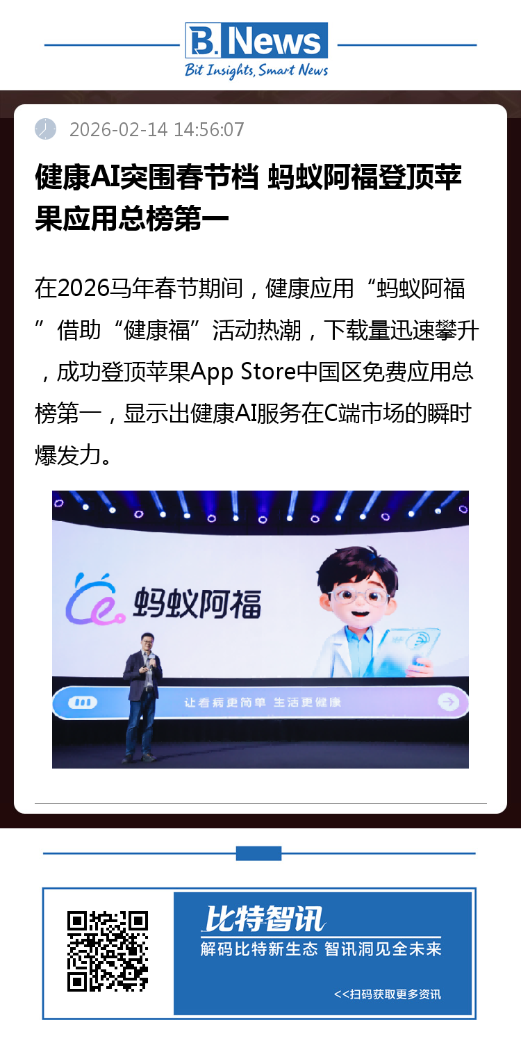 2月14日,苹果App Store中国区免费应用排行榜显示,健康AI应用“蚂蚁阿福”与AI助手“千问”下载量猛增,“蚂蚁阿福”在医疗与AI类应用中已位列榜首,并与千问、元宝等AI助手共同占据下载排行榜前列位置,反映出AI健康及助手类产品在春节假期的用户关注度持续走高。
