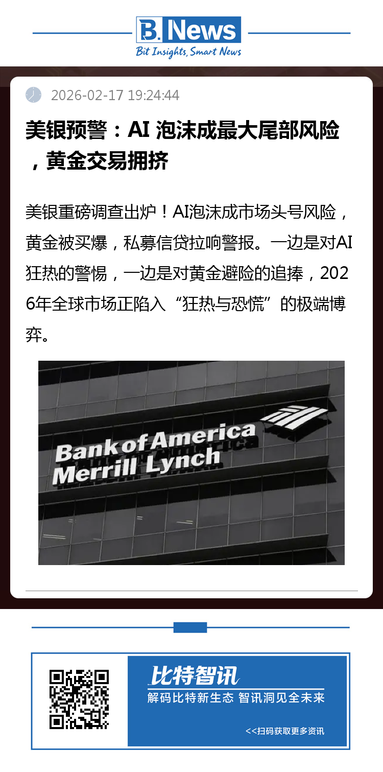 2026年开年以来,全球金融市场在科技狂热与避险情绪的交织中剧烈震荡。美国银行最新发布的2月基金经理调查(FMS)释放重磅信号:人工智能泡沫被列为市场首要尾部风险,做多黄金成为当前最拥挤交易,同时私募信贷被认定为最可能触发信用事件的领域。这份覆盖主流机构投资者的调查,精准勾勒出当下华尔街的焦虑与配置转向,为全球资产定价敲响警钟。