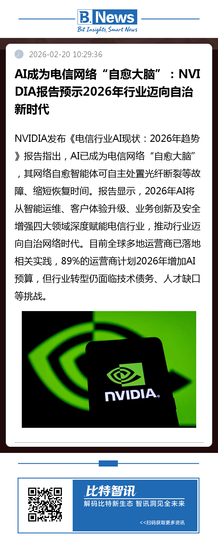 2月20日,全球科技巨头NVIDIA于发布《电信行业AI现状:2026年趋势》报告,明确指出人工智能正加速重塑电信网络运营模式,成为驱动行业转型的核心引擎——AI已正式升级为电信网络的“自愈大脑”,有望在2026年推动全球电信行业全面迈入自治网络时代,彻底改变传统网络运维的被动格局。