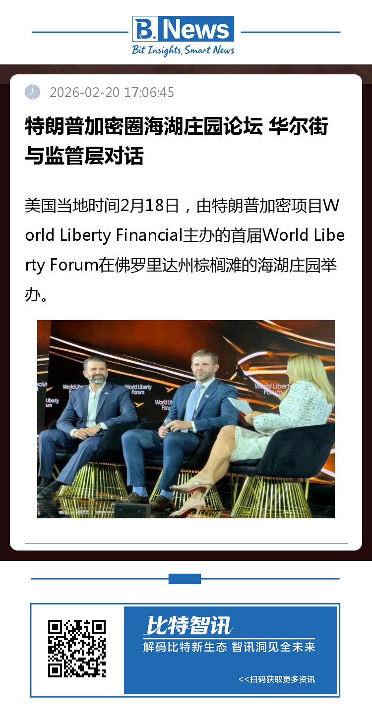 美国当地时间2月18日,由特朗普加密项目World Liberty Financial主办的首届World Liberty Forum在佛罗里达州棕榈滩的海湖庄园举办。论坛云集高盛CEO David Solomon、Coinbase CEO Brian Armstrong、CFTC主席Michael Selig、纳斯达克CEO Adena Friedman、富兰克林邓普顿CEO Jenny Johnson、纽交所总裁Lynn Martin等金融巨头和监管高层。体育、文化界也有国际足联主席Gianni Infantino、说唱歌手Nicki Minaj等出席。特朗普长子Donald Trump Jr.和次子Eric Trump作为主办方代表亮相。