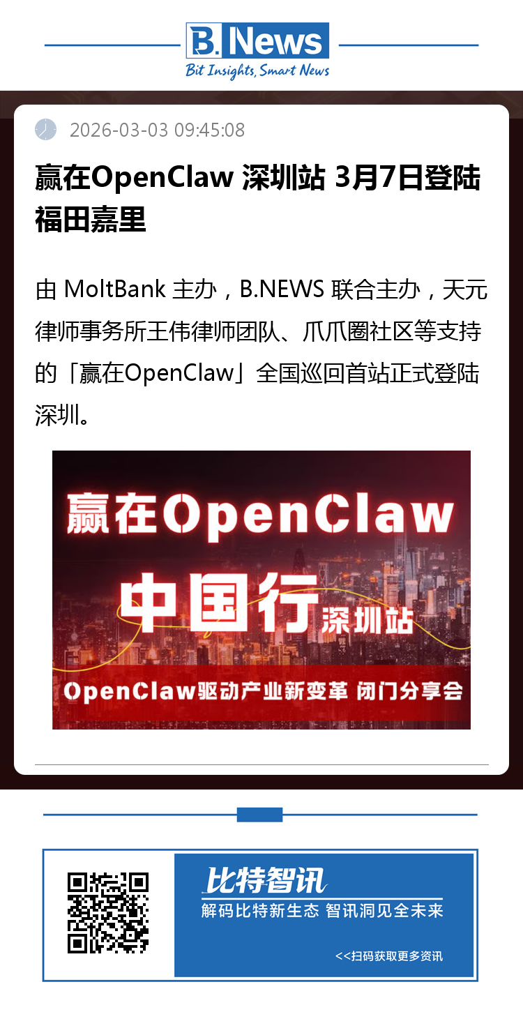 由 MoltBank 主办,B.NEWS 联合主办,天元律师事务所王伟律师团队、爪爪圈社区等支持的「赢在OpenClaw」全国巡回首站正式登陆深圳。