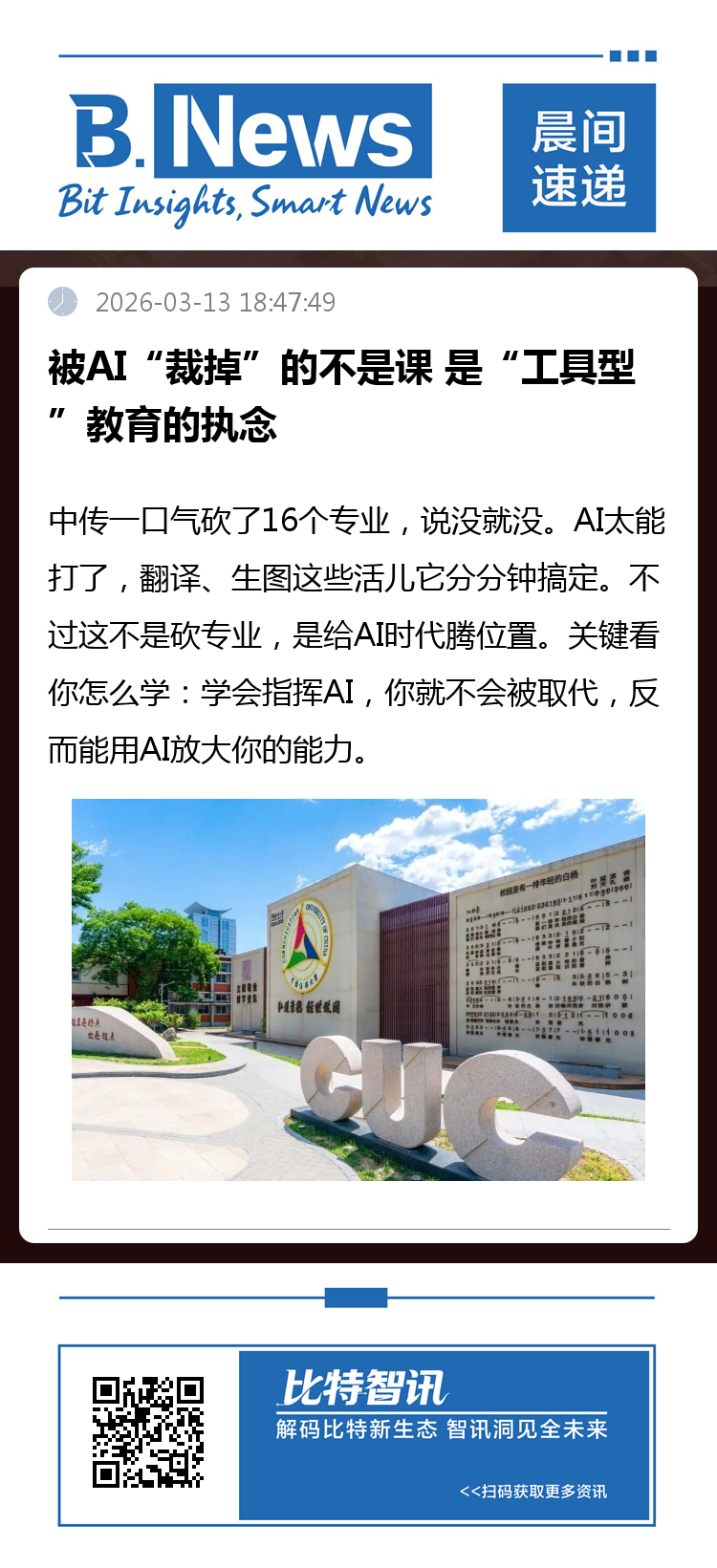 专业可以调,课堂可以变,但教育的根本使命不会变,以教育之强夯实国家富强之基,这步"先手棋",我们必须下好,也一定能下好。中国传媒大学"砍掉"16个专业,标志着高校专业"终身制"彻底终结,动态调整成为常态。教育部建立年度专业更新机制,未来高校会像企业迭代产品一样,持续优化专业设置,这是教育改革的必然。