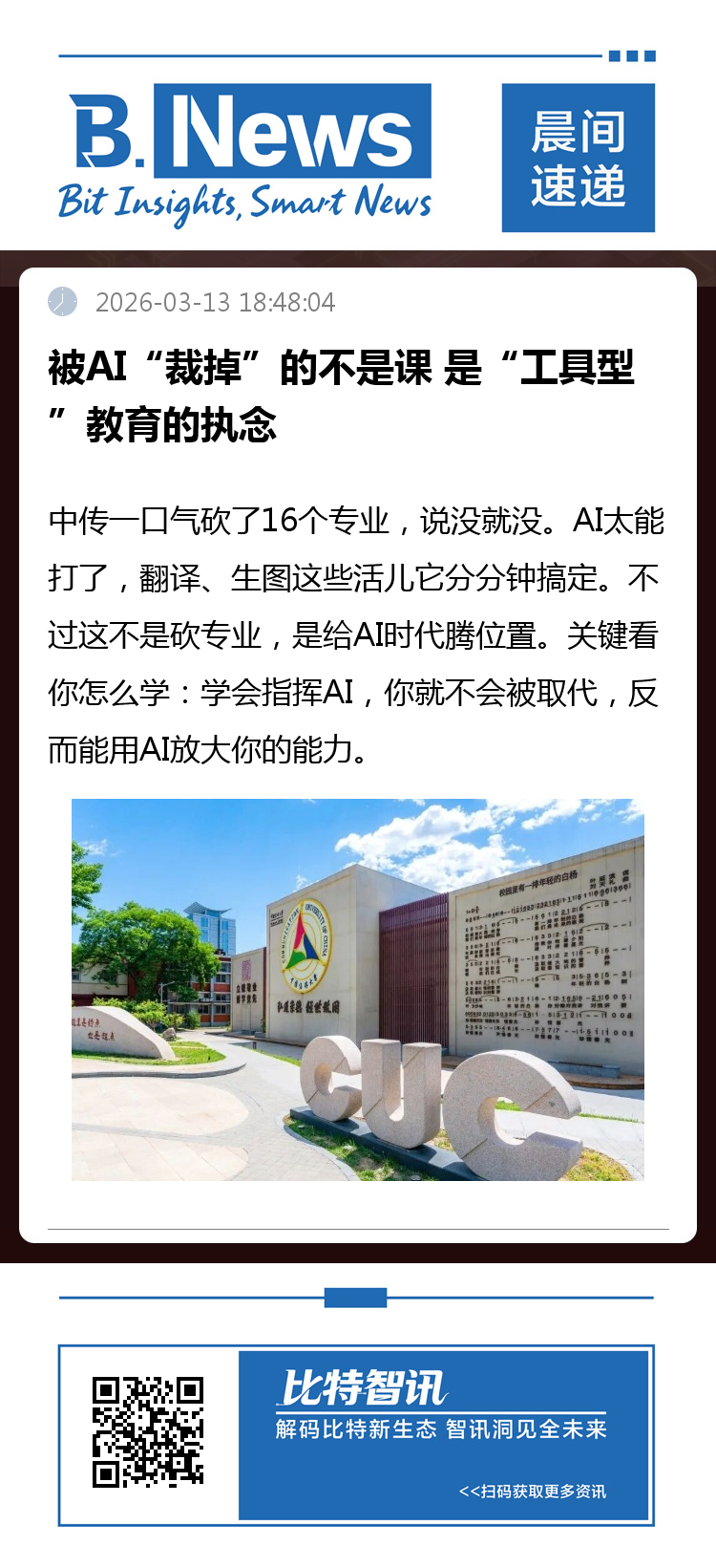 然而现实中,师生间因技术使用能力差异产生的"数字代沟"正在扩大,这需要双方共同努力。老师看不惯学生觉得学生缺乏刻苦钻研精神,学生看不上老师觉得"你使用AI比我差远了",这种矛盾需要化解。中传调整专业,表面看是"减法",实则是"加法",顺应潮流、拥抱未来,是贯穿始终的改革逻辑。不只中传,四川大学、山东师范大学、中国科学技术大学等一批高校都在主动调整学科专业布局,这是时代趋势。