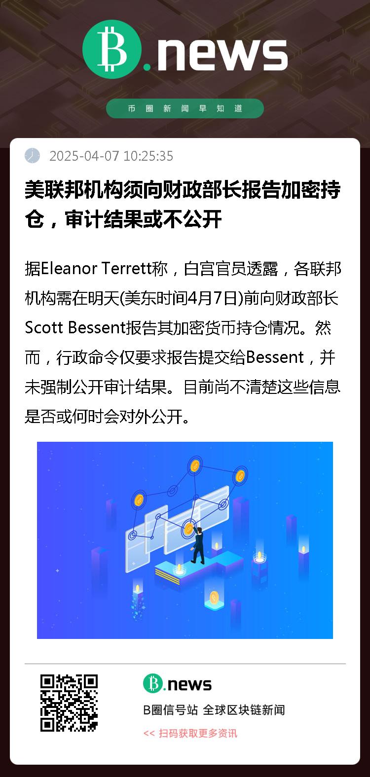据Eleanor Terrett称,白宫官员透露,各联邦机构需在明天(美东时间4月7日)前向财政部长Scott Bessent报告其加密货币持仓情况。