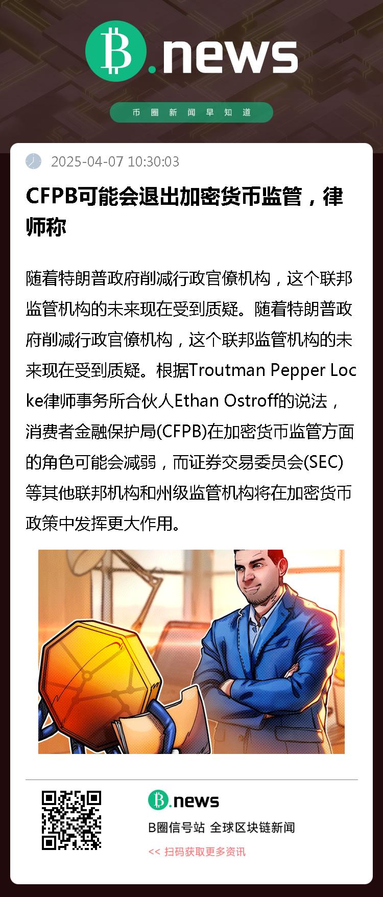 随着特朗普政府削减行政官僚机构,这个联邦监管机构的未来现在受到质疑。根据Troutman Pepper Locke律师事务所合伙人Ethan Ostroff的说法,消费者金融保护局(CFPB)在加密货币监管方面的角色可能会减弱,而证券交易委员会(SEC)等其他联邦机构和州级监管机构将在加密货币政策中发挥更大作用。