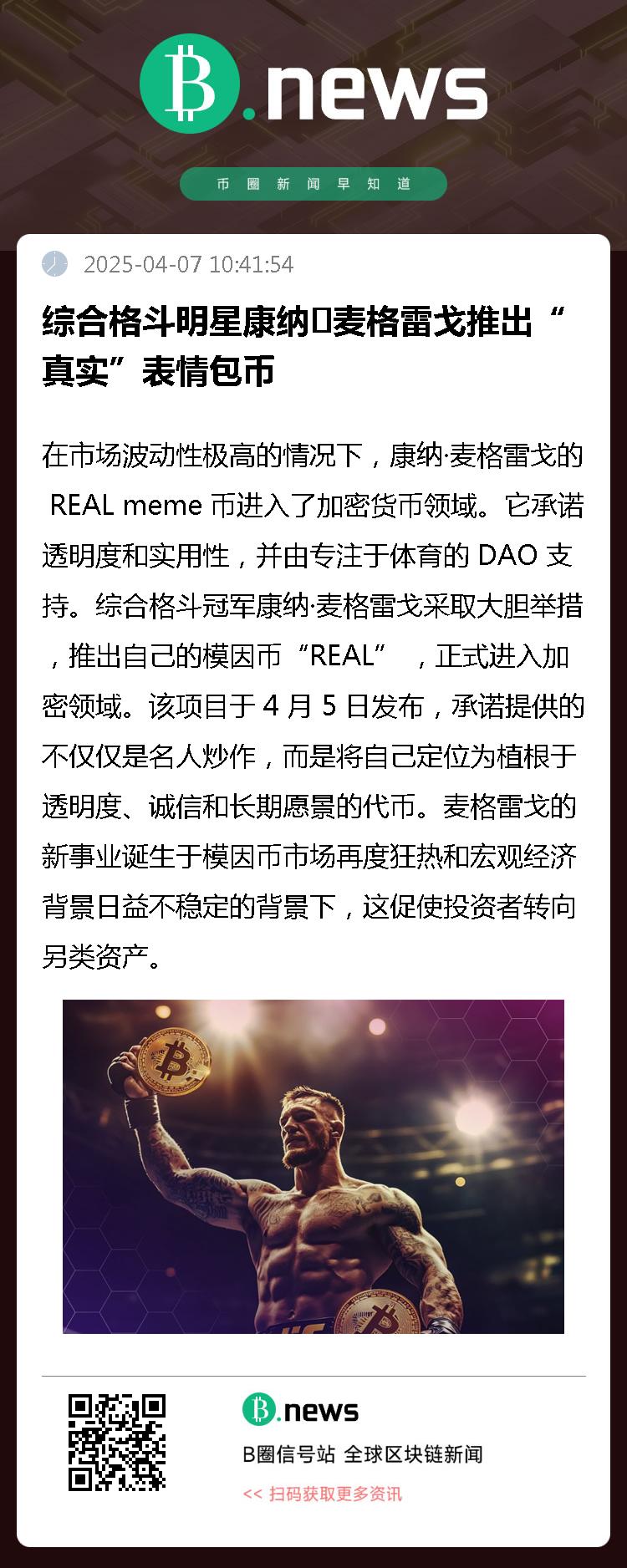 综合格斗冠军康纳·麦格雷戈采取大胆举措,推出自己的模因币“REAL” ,正式进入加密领域。