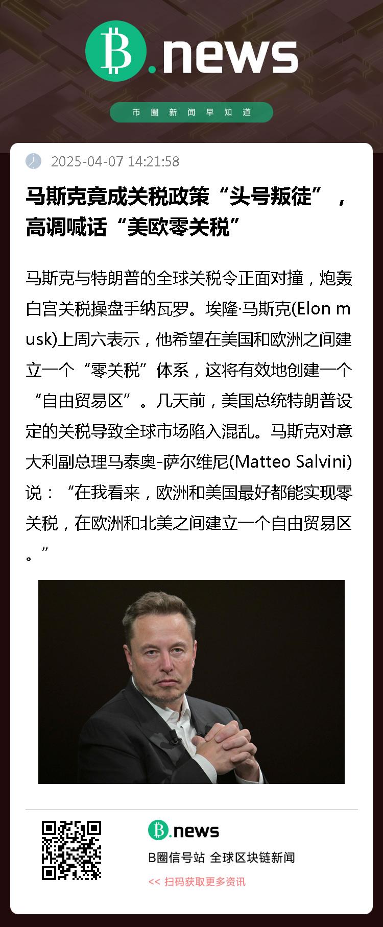 马斯克对意大利副总理马泰奥-萨尔维尼(Matteo Salvini)说:“在我看来,欧洲和美国最好都能实现零关税,在欧洲和北美之间建立一个自由贸易区。”