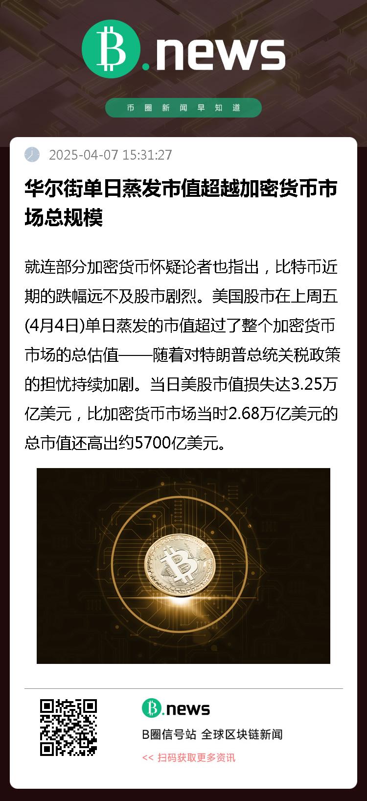 当日美股市值损失达3.25万亿美元,比加密货币市场当时2.68万亿美元的总市值还高出约5700亿美元。