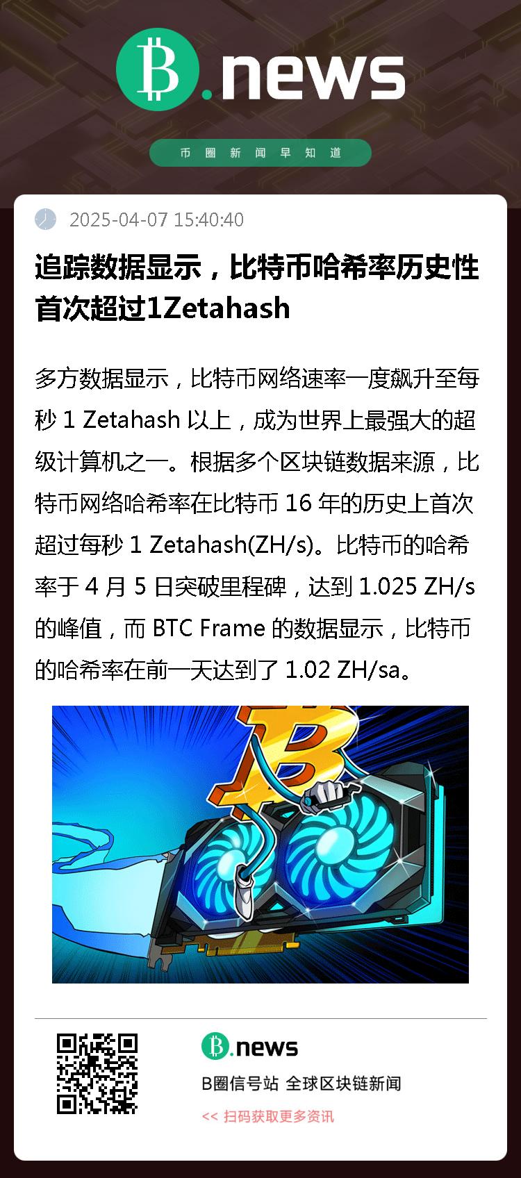 根据mempool.space 的数据,比特币的哈希率于 4 月 5 日突破里程碑,达到 1.025 ZH/s 的峰值,而 BTC Frame 的数据显示,比特币的哈希率在前一天达到了 1.02 ZH/sa。