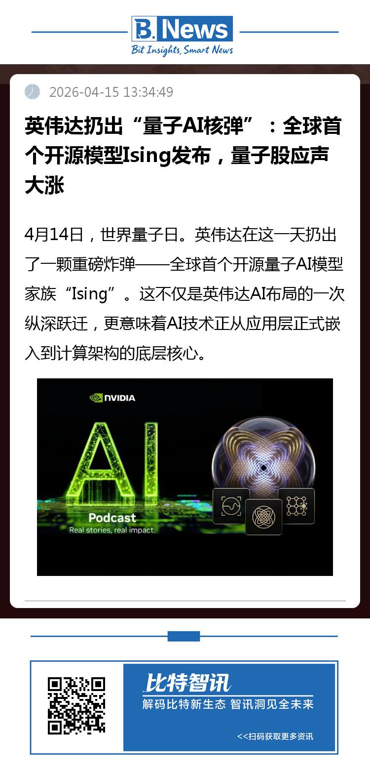 4月14日,英伟达宣布推出全球首个面向量子计算的开源AI模型家族“Ising”,旨在解决制约量子计算机大规模实用化的两大核心瓶颈——量子处理器校准与量子纠错解码。