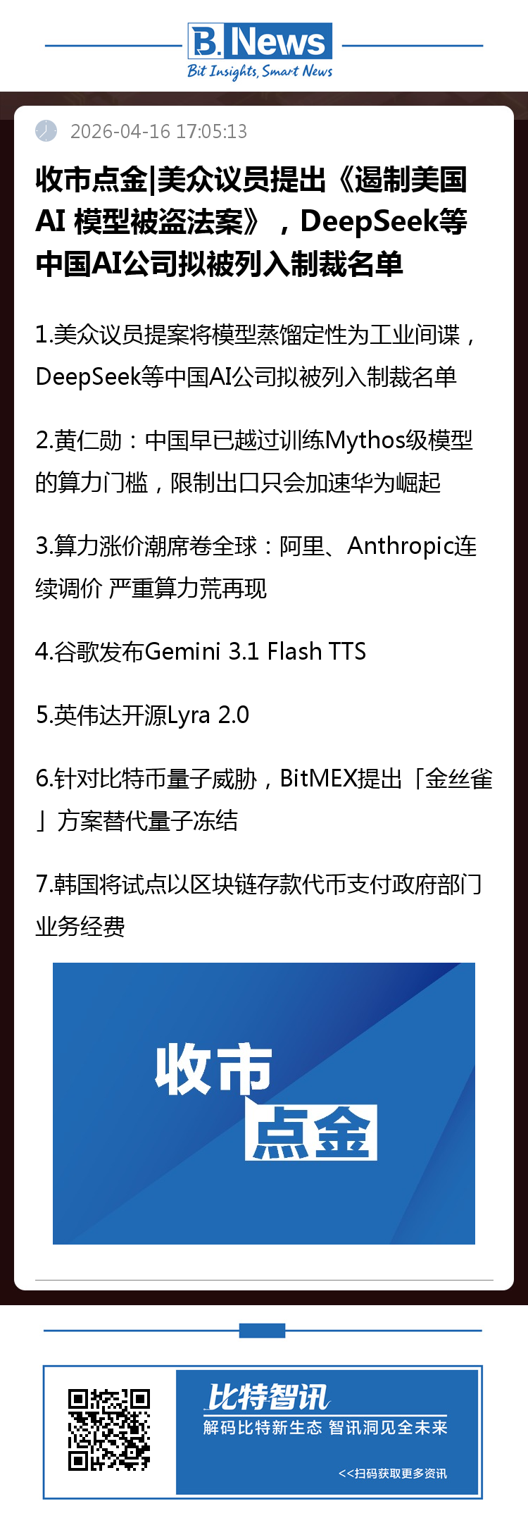 美国众议院共和党议员 Bill Huizenga 提出《遏制美国 AI 模型被盗法案》,要求政府识别中国和俄罗斯利用「查询复制」技术从美国 AI 模型中提取能力的主体,并授权商务部将其列入实体清单,或援引 1977 年《国际紧急经济权力法》对其实施制裁。该法案由众议院中国问题特别委员会主席 John Moolenaar 联署,预计下周在众议院外交委员会审议。