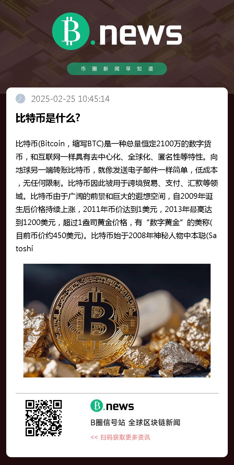 比特币(Bitcoin,缩写BTC)是一种总量恒定2100万的数字货币,和互联网一样具有去中心化、全球化、匿名性等特性。向地球另一端转账比特币,就像发送电子邮件一样简单,低成本,无任何限制。比特币因此被用于跨境贸易、支付、汇款等领域。