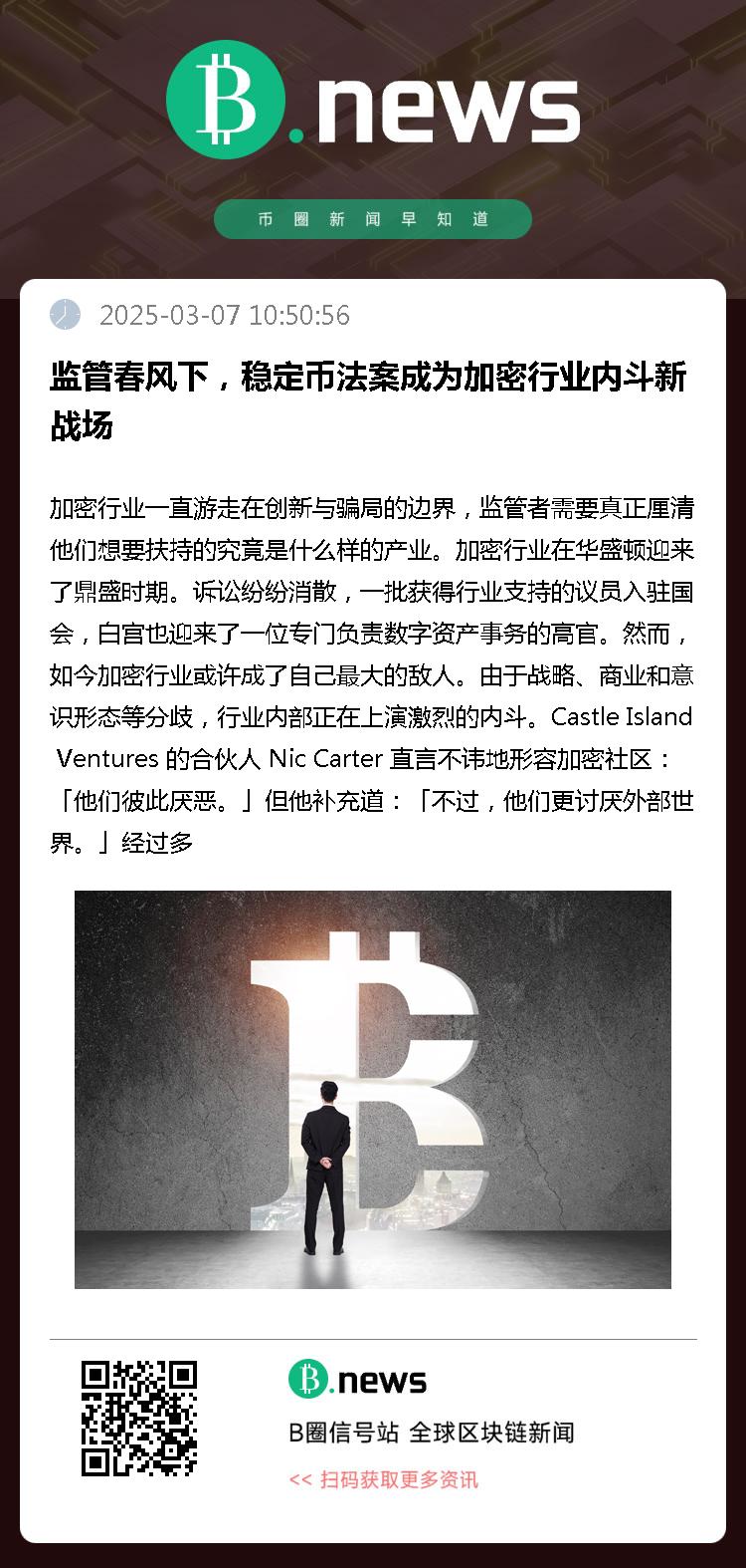 即便是最不具争议的稳定币法案——针对与美元挂钩的私营数字货币的监管框架——如今也被卷入了加密行业内部的纷争。