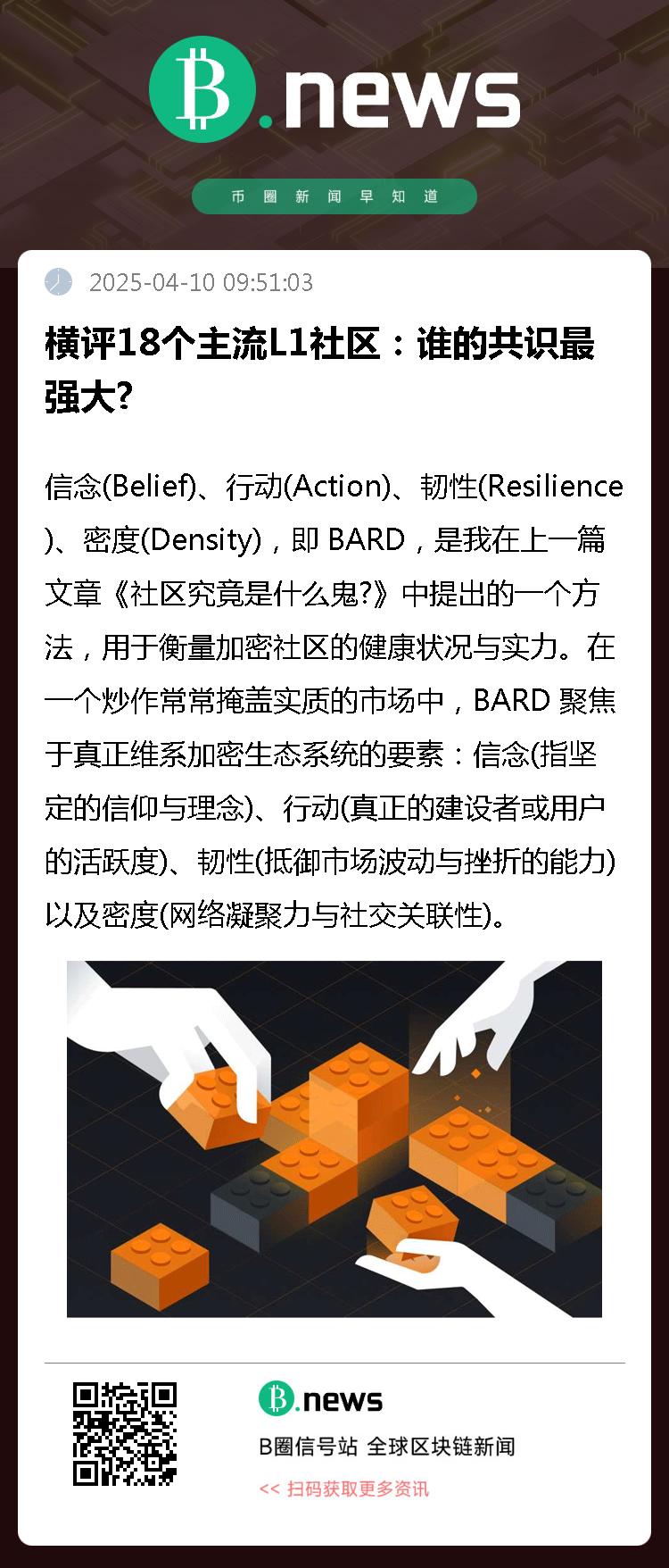 信念(Belief)、行动(Action)、韧性(Resilience)、密度(Density),即 BARD,是我在上一篇文章《社区究竟是什么鬼?》中提出的一个方法,用于衡量加密社区的健康状况与实力。在一个炒作常常掩盖实质的市场中,BARD 聚焦于真正维系加密生态系统的要素:信念(指坚定的信仰与理念)、行动(真正的建设者或用户的活跃度)、韧性(抵御市场波动与挫折的能力)以及密度(网络凝聚力与社交关联性)。