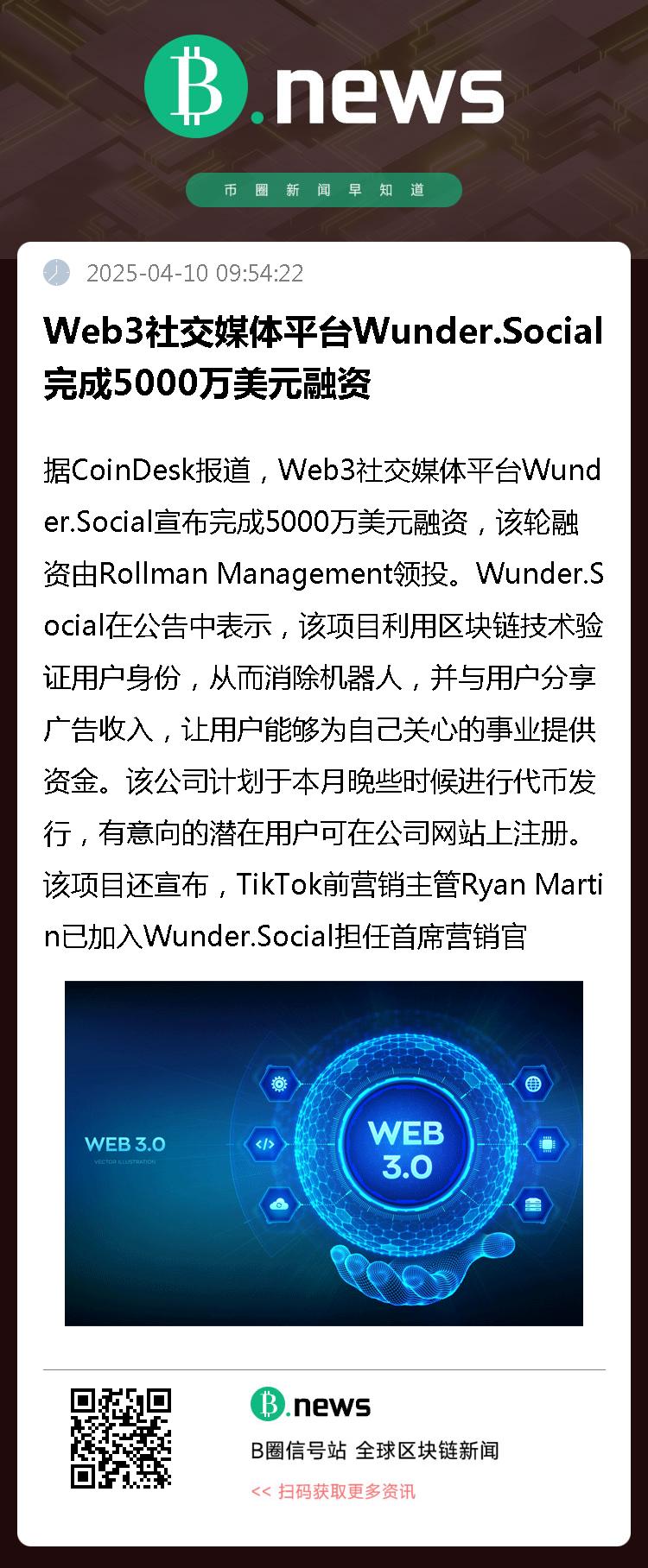 据CoinDesk报道,Web3社交媒体平台Wunder.Social宣布完成5000万美元融资,该轮融资由Rollman Management领投。Wunder.Social在公告中表示,该项目利用区块链技术验证用户身份,从而消除机器人,并与用户分享广告收入,让用户能够为自己关心的事业提供资金。