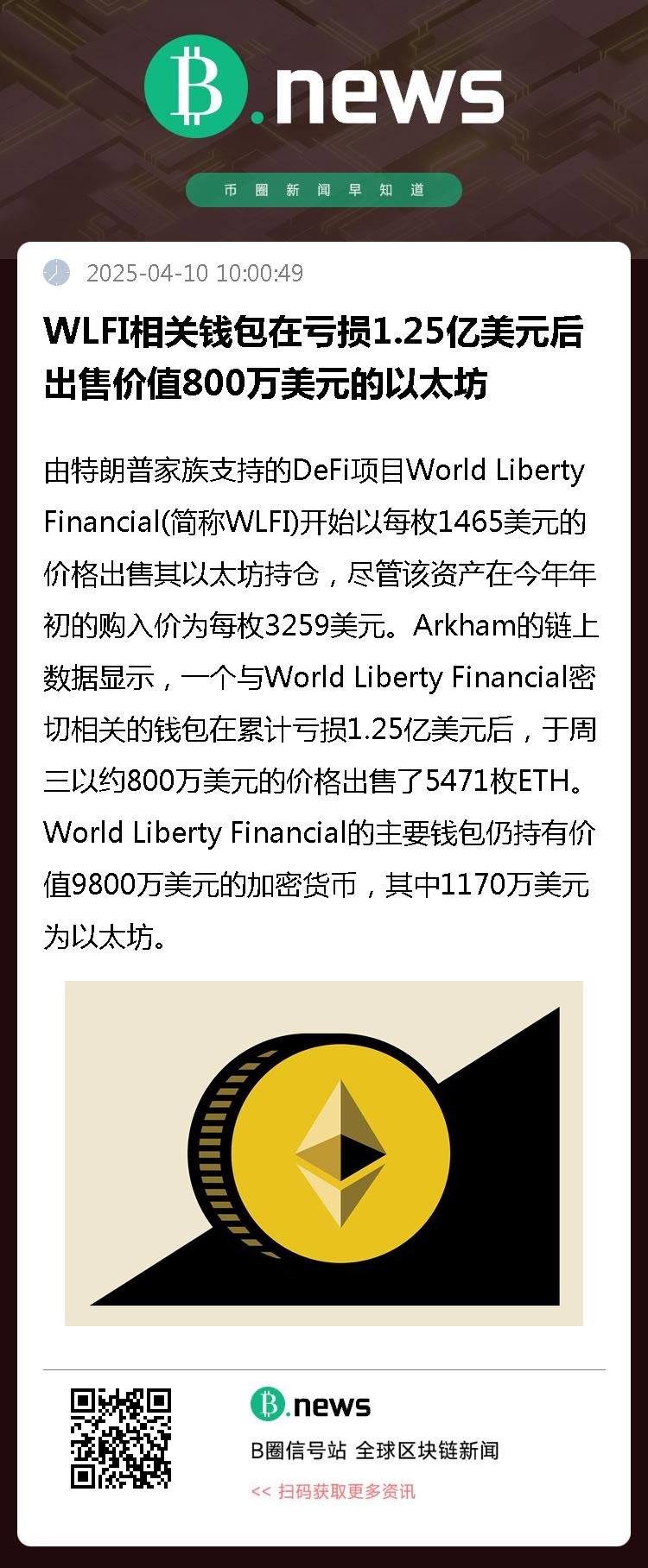 Arkham的链上数据显示,一个与World Liberty Financial密切相关的钱包在累计亏损1.25亿美元后,于周三以约800万美元的价格出售了5471枚ETH。